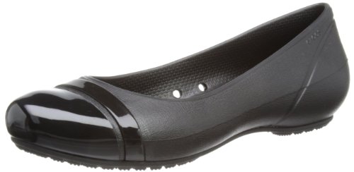 Crocs Cap Toe Flat are a fabulous day pump which are also suitable for work and nights out Made with a durable black Croslite base topped with a glossy toe cap for a spot of glamour Easy slip on design with a moulded Croslite foot-bed, complete with circulation nubs to massage the feet as you walk, delivering long lasting comfort Built with a hard wearing, textured rubber sole to provide you with plenty of grip